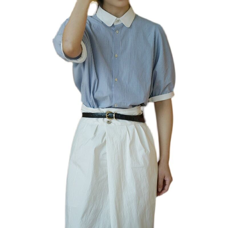 ブラウス シャツ 半袖 パフスリーブ ストライプ 大人カジュアル 爽やか デート お出かけ 夏