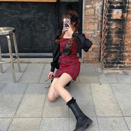 ワンピース デザイン チェック レッド グレー 長袖 ミニ ショート タイト パフスリーブ