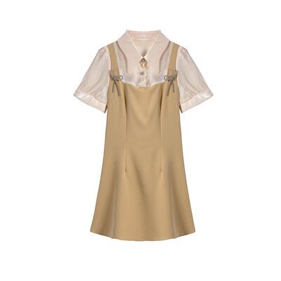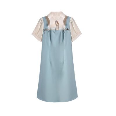 ワンピース 半袖 ミニ丈 ひざ丈 重ね着風 襟付き リボン フレア 大人可愛い きれいめ デート お出かけ