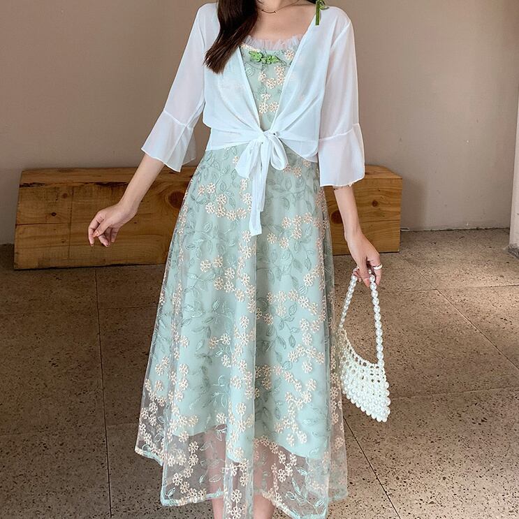 セットアップ ツーピース カーディガン ボレロ 半袖 ショート丈 ワンピース ノースリーブ ひざ丈 小花柄