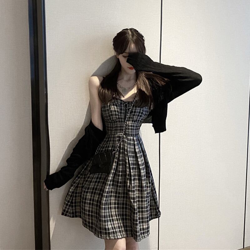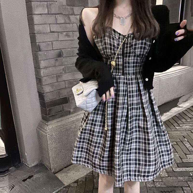 おとなカジュアルな無地デザインの長袖カーディガンとチェック柄ワンピースのセットです♪