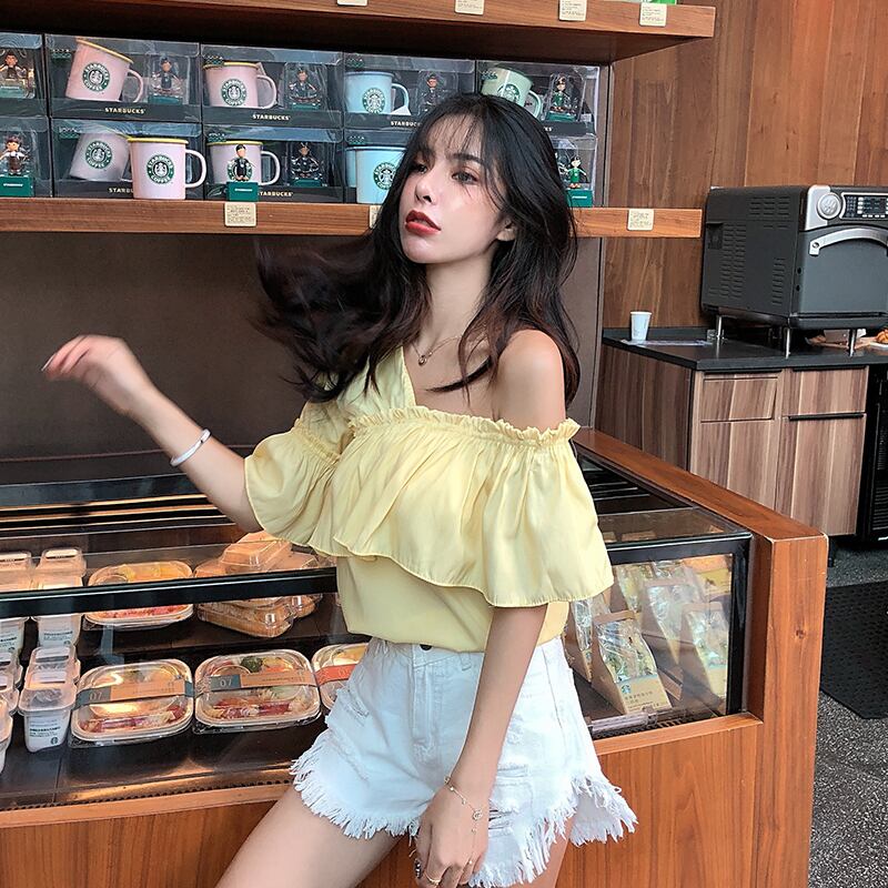 ブラウス カットソー 半袖 ワンショルダー フリル 無地 カジュアル キュート デート 夏