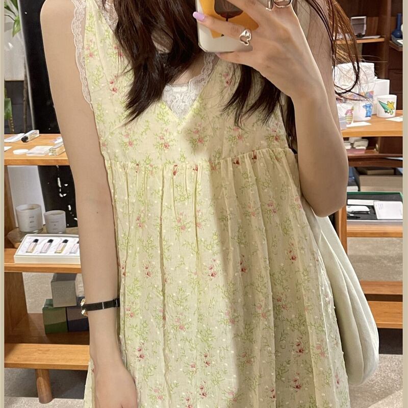 ワンピース ノースリーブ ロング丈 フレア 小花柄 Vネック レース 大人可愛い デート お出かけ 夏