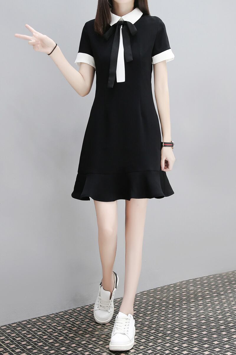 ワンピース ドレス 半袖 ミニ ショート フレア スリム ブラック リボン
