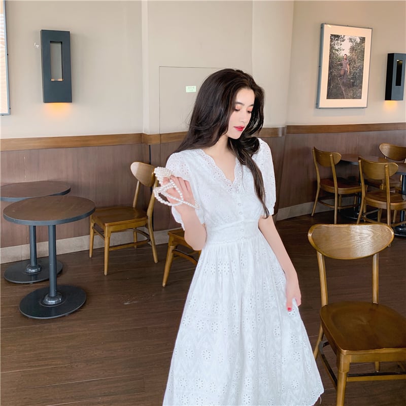 ワンピース 半袖 ミモレ丈 フレア コットンレース パフスリーブ くびれデザイン 大人可愛い デート