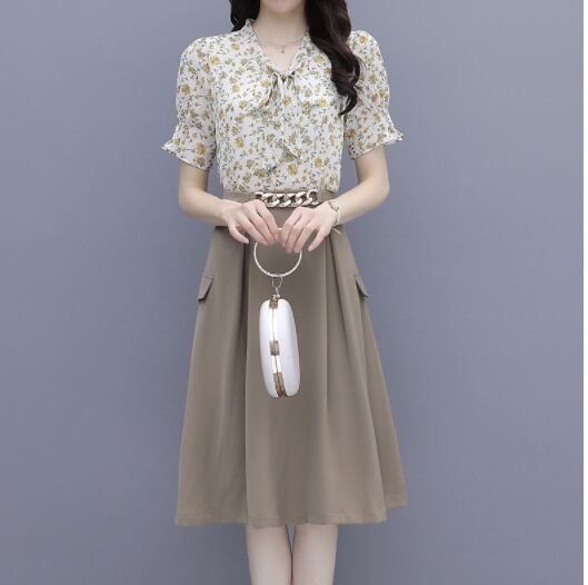 セットアップ ツーピース ブラウス 半袖 小花柄 スカート 膝丈フレア チェーン きれいめ 上品