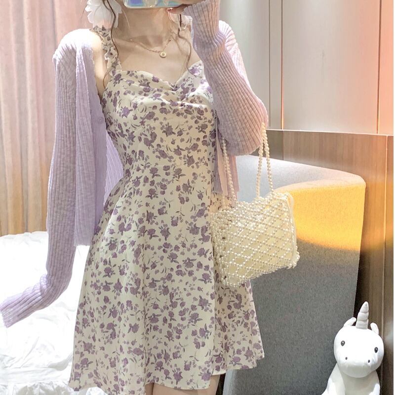 セットアップ ワンピース カーディガン パープル ミニ ショート セクシー ドレス 花柄 タイト
