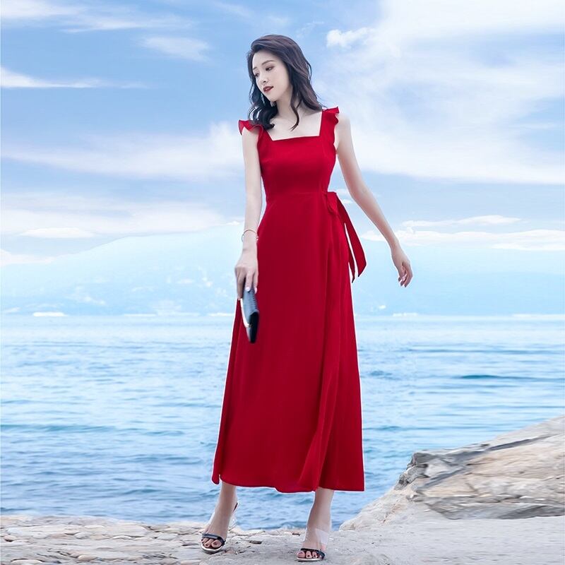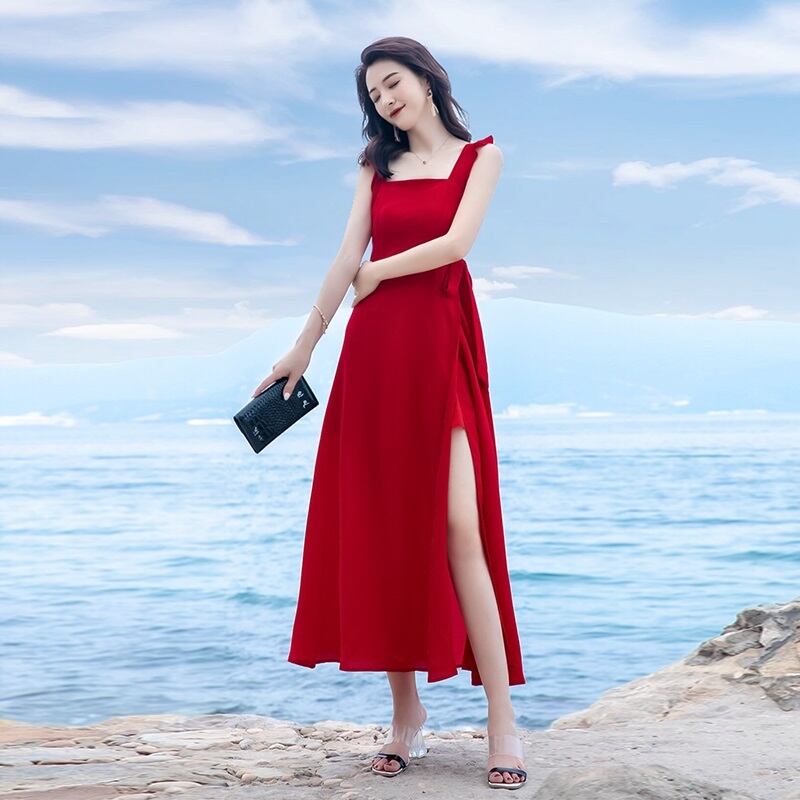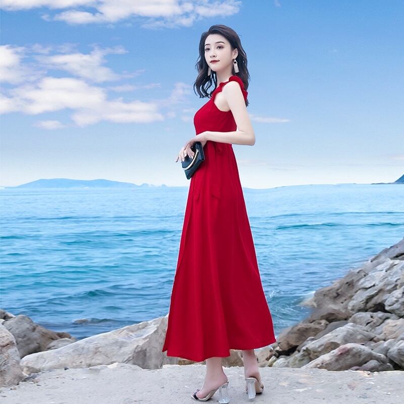 ワンピース ノースリーブ ロング丈 フレア スリット くびれデザイン シンプル 無地 きれいめ 夏