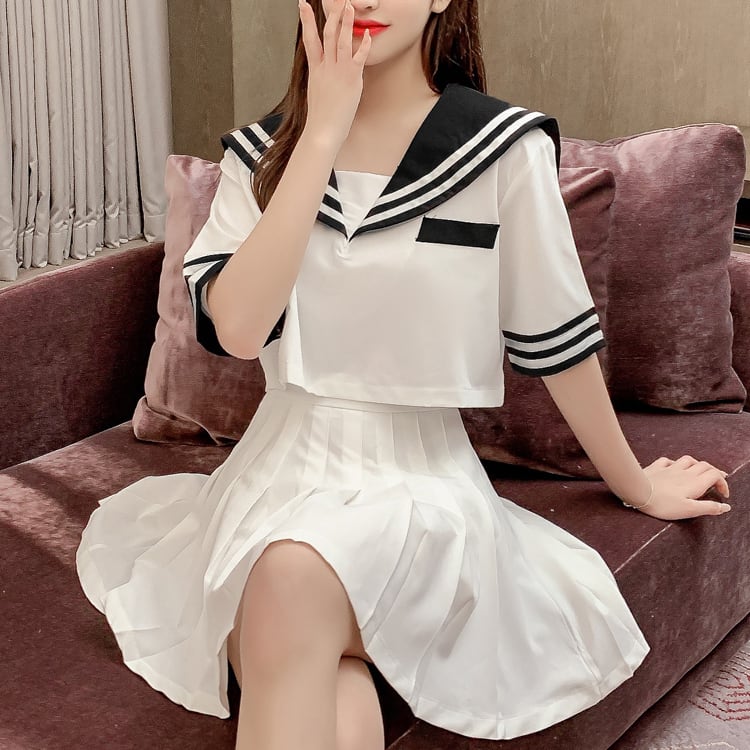 セーラー風の半袖ブラウスとミニ丈スカートのセットアップです。