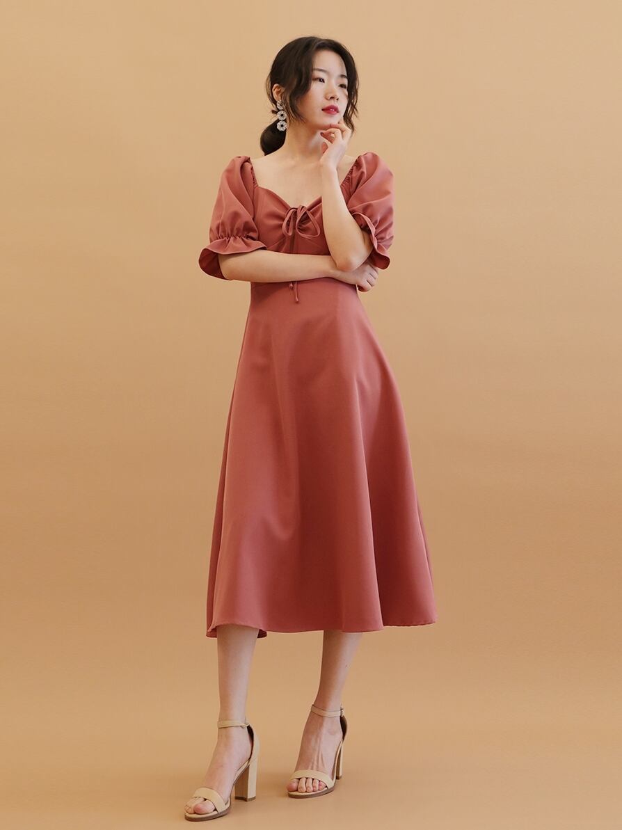 ワンピース 半袖 ミモレ丈 フレア レースアップパフスリーブ シンプル 無地 きれいめ 大人可愛い