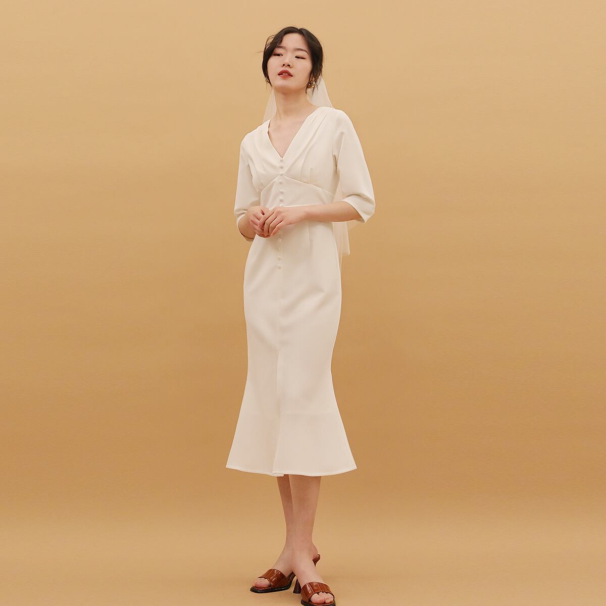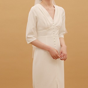 ワンピース 半袖 ミモレ丈 タイト マーメイド Vネック くびれデザイン シンプル 無地 きれいめ