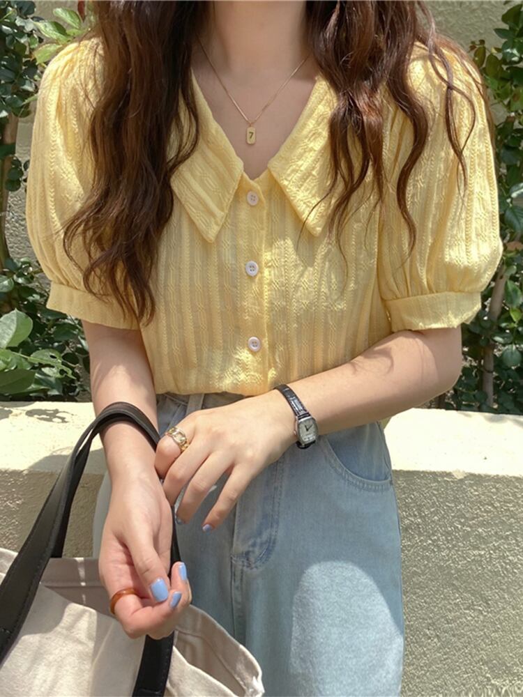 ブラウス シャツ 半袖 パフスリーブ ショート丈 シンプル 無地 大人カジュアル デート お出かけ