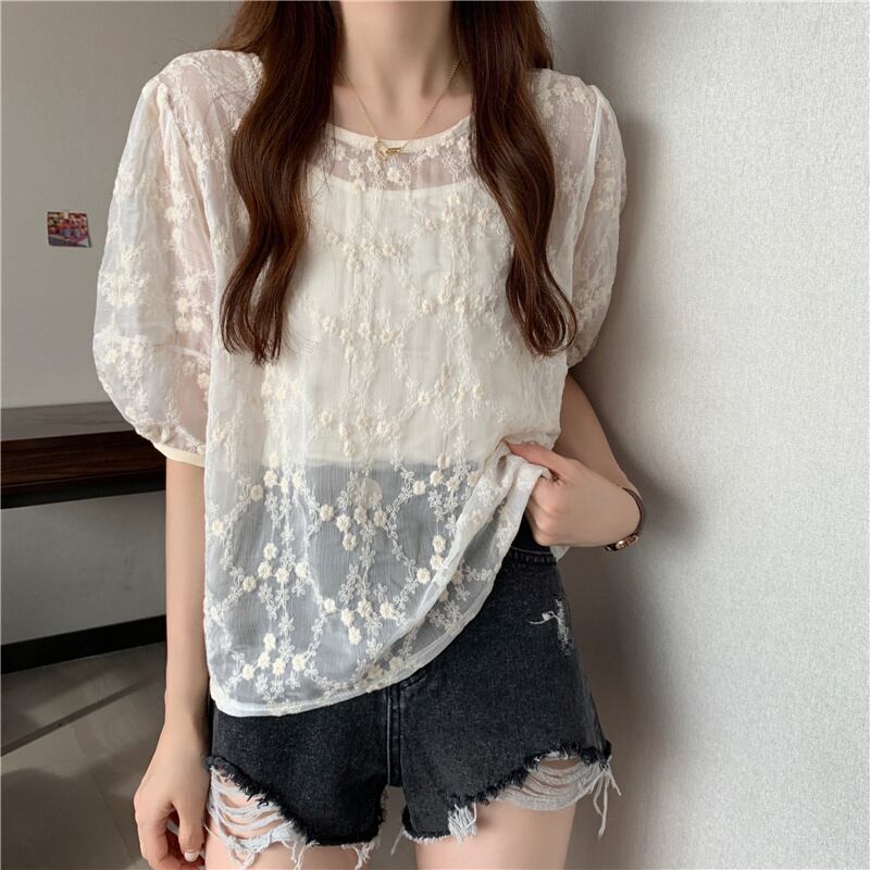 ブラウス 半袖 パフスリーブ フラワーレース シアー 透け感 大人可愛い デート お出かけ