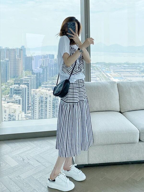 セットアップ ツーピース カットソー Tシャツ 半袖 重ね着風 スカート ロングスカート ボーダー柄