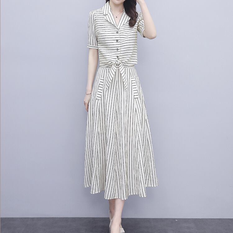 セットアップ ツーピース ブラウス 半袖 ショート丈 スカート ロング丈 フレア ボーダー柄 大人カジュアル