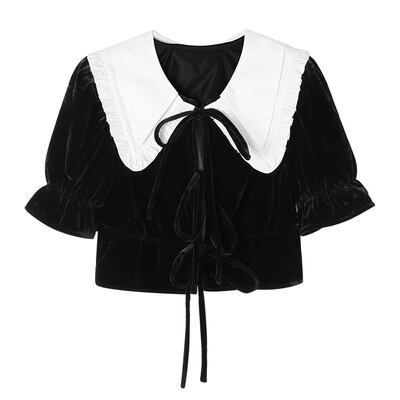 ブラウス カットソー 半袖 ショート丈 パフスリーブ ビックカラー リボン 大人可愛い デート
