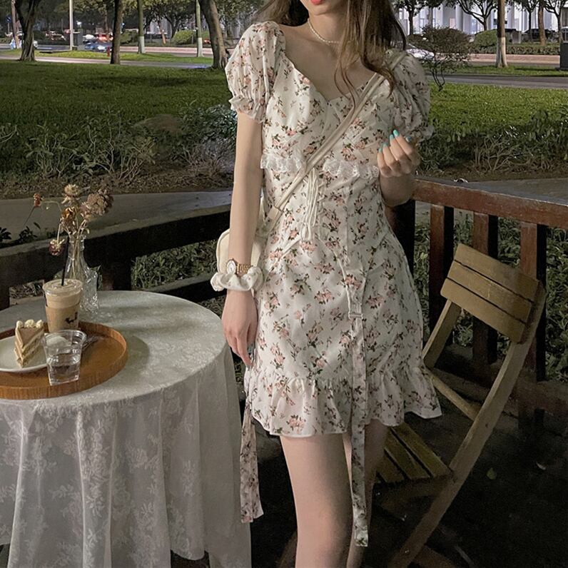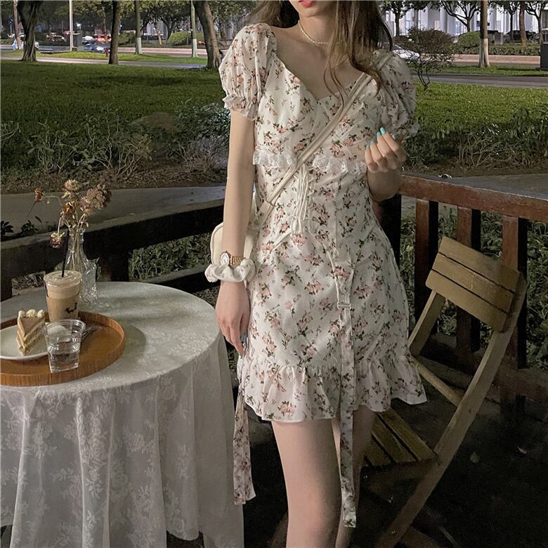 ワンピース 半袖ミニ丈 パフスリーブ 小花柄 レース 大人可愛い きれいめ キュート デート