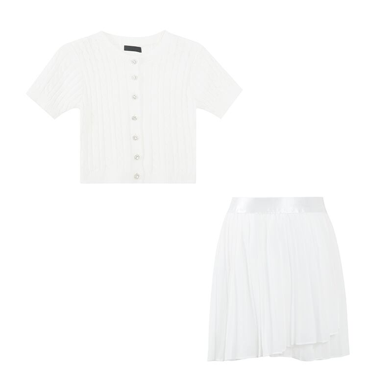 大人可愛いパフスリーブデザインのニットカーディガンとミニ丈スカートです。
