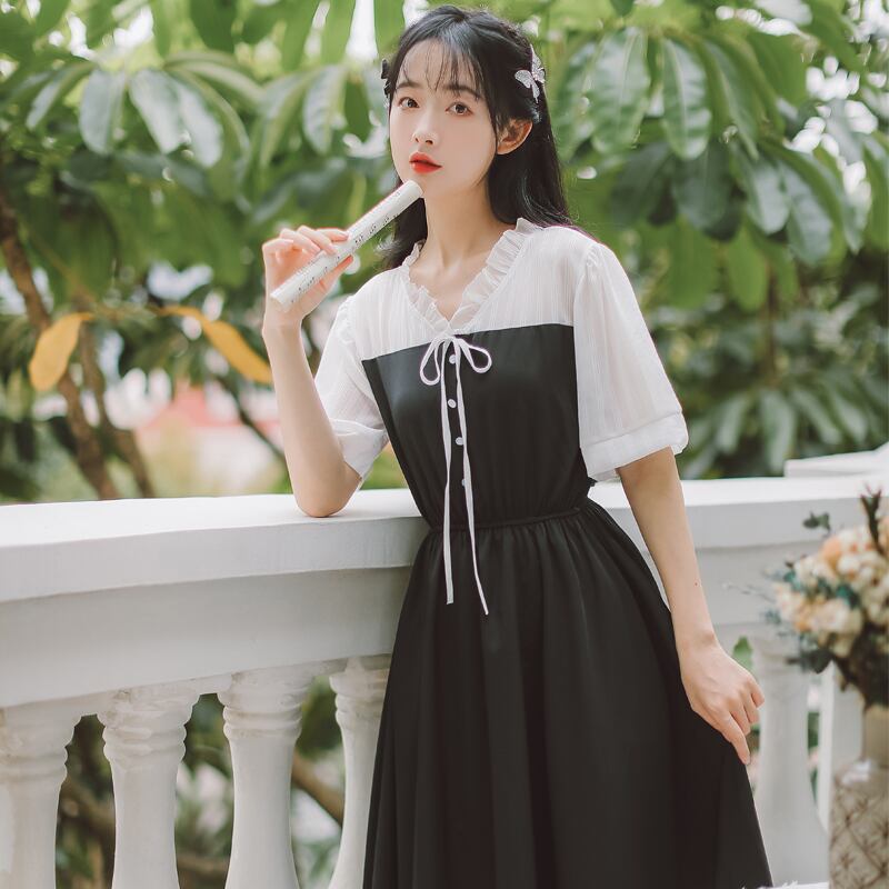ワンピース 半袖 膝丈 フレア バイカラー フリル きれいめ 大人可愛い デート お出かけ