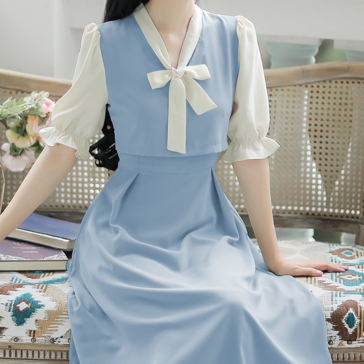 ワンピース 半袖 膝丈 フレア リボン 重ね着風 大人可愛い デート お出かけ 上品 きれいめ 清楚