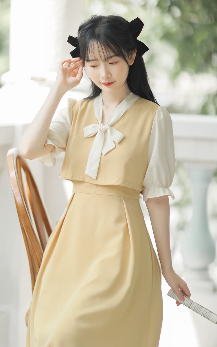 大人可愛い重ね着風デザインの膝丈ワンピースです。