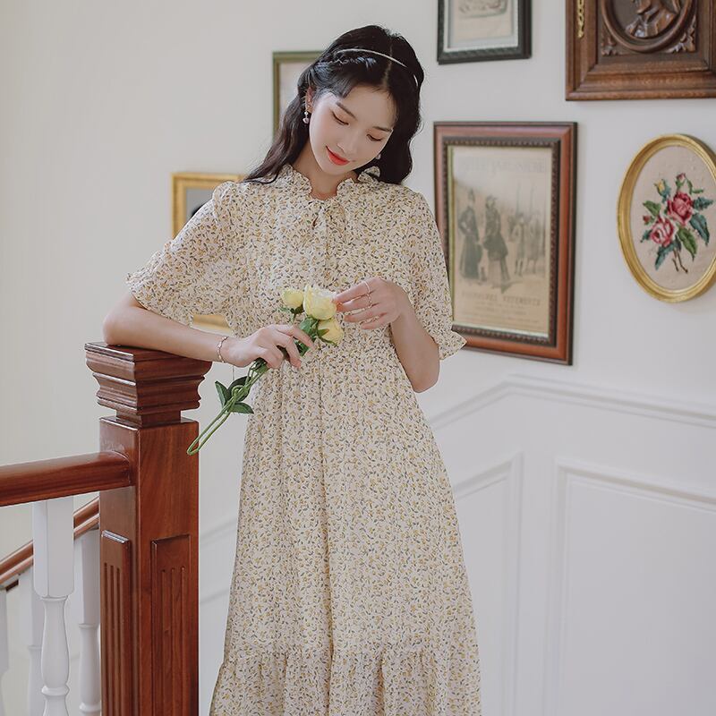 ワンピース シフォンワンピース 半袖 膝丈 フレア 小花柄 大人可愛い デート お出かけ レトロ