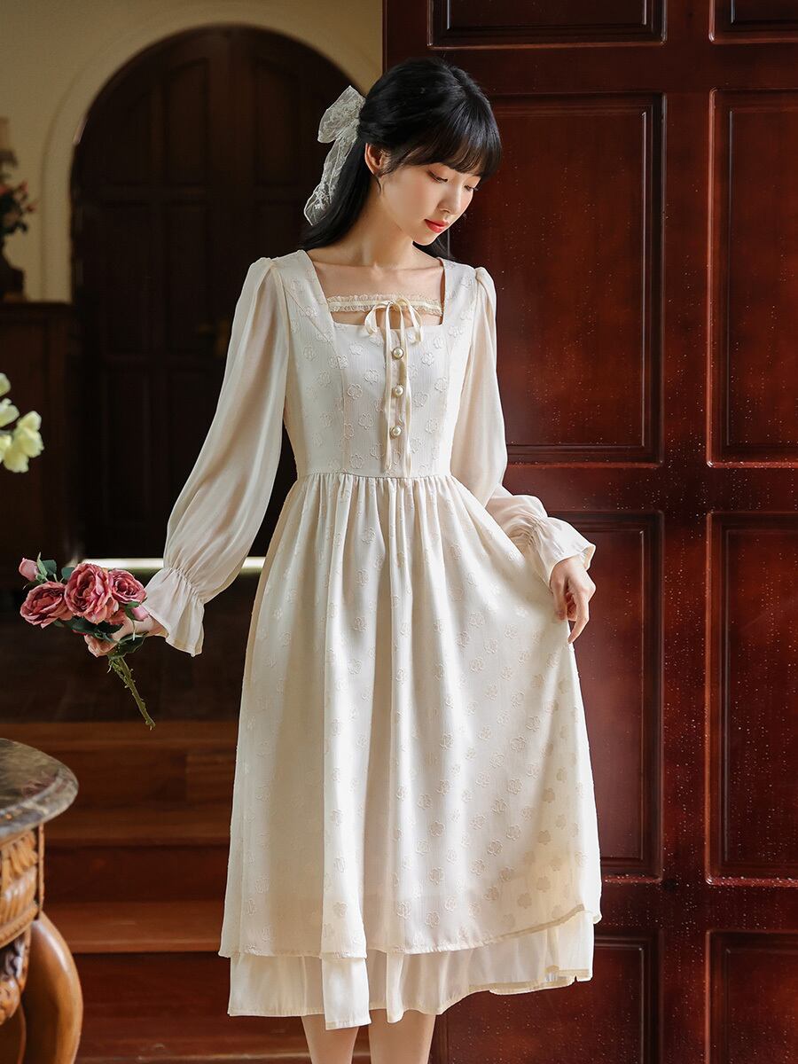 ワンピース シフォンワンピース 長袖 膝丈 フレア スクエアネック パールボタン シンプル 無地 きれいめ