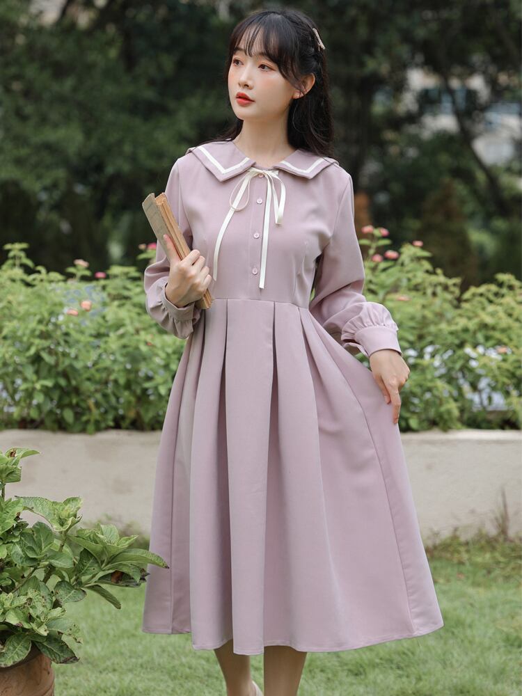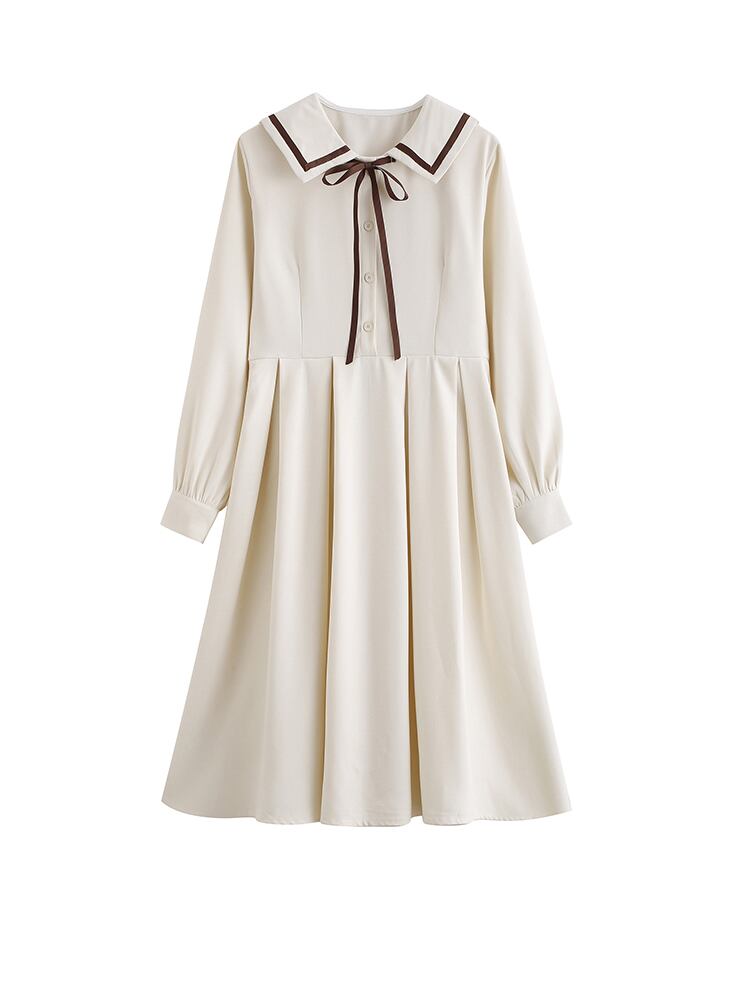ワンピース 長袖 膝丈 フレア 襟付き シンプル 無地 きれいめ 上品 清楚 デート お出かけ 秋
