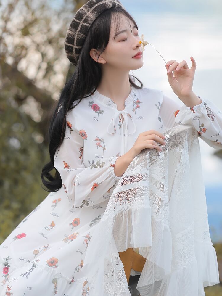 ワンピース シフォンワンピース 長袖 膝丈 フレア フリル 小花柄 大人可愛い デート お出かけ