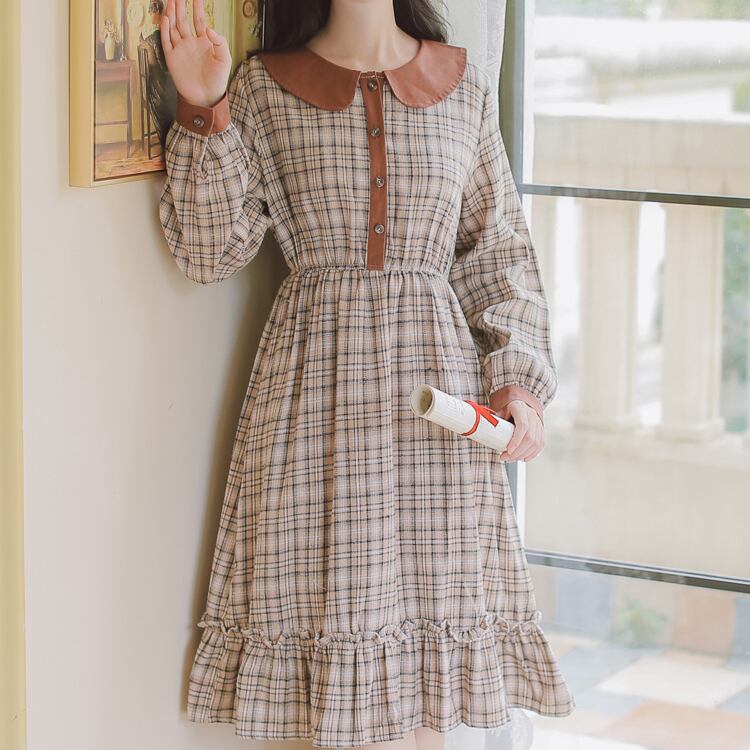 ワンピース 長袖 膝丈フレア チェック柄 襟付き くびれデザイン トラッド 大人カジュアル デート