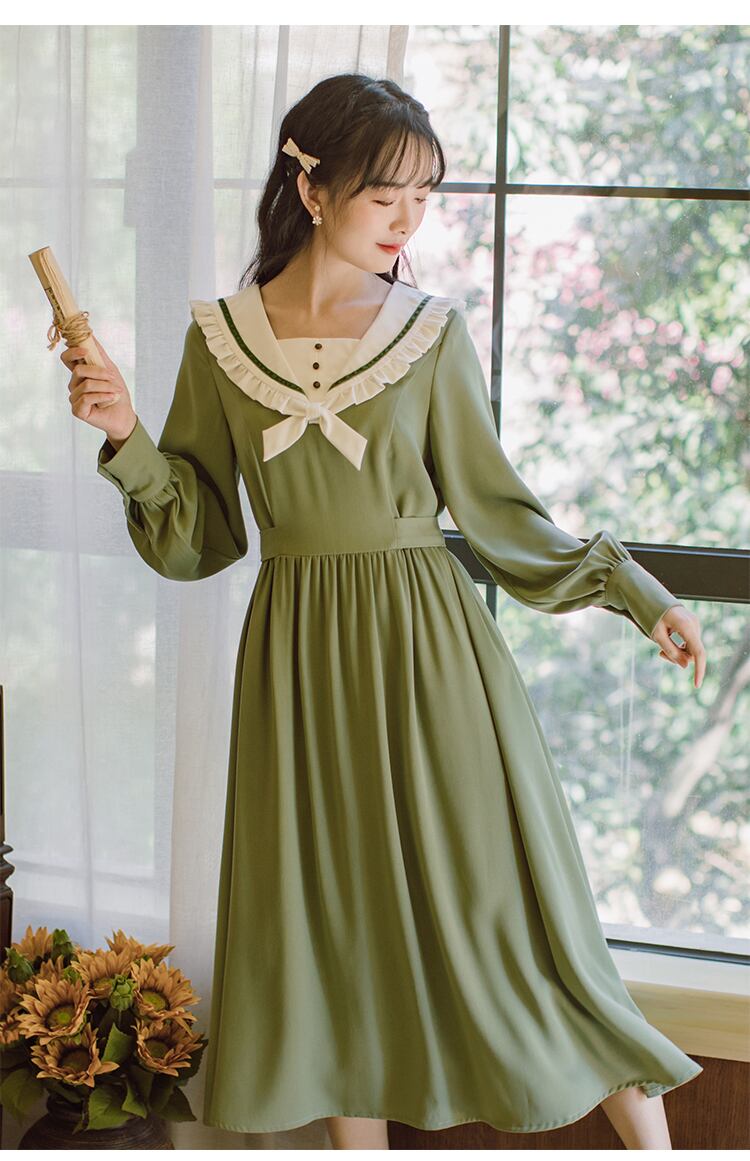 ワンピース 長袖 膝丈 フレア 丸襟 シンプル 無地 きれいめ 大人可愛い 清楚 デート お出かけ