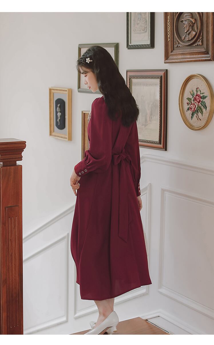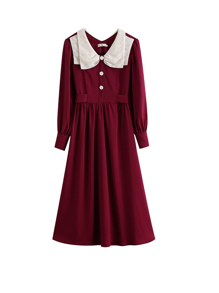 ワンピース 長袖 膝丈 フレア ビックカラー くびれデザイン パールボタン 大人可愛い きれいめ 上品