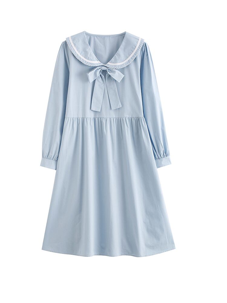 ワンピース 長袖 膝丈 フレア ビックカラー リボン セーラー風 シンプル 無地 大人可愛い デート