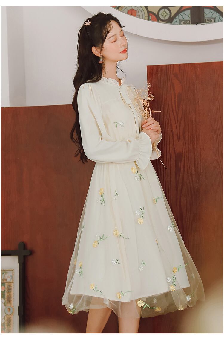 ワンピース 長袖 膝丈 フレア チュール 小花柄 大人可愛い きれいめ 上品 デートお出かけ