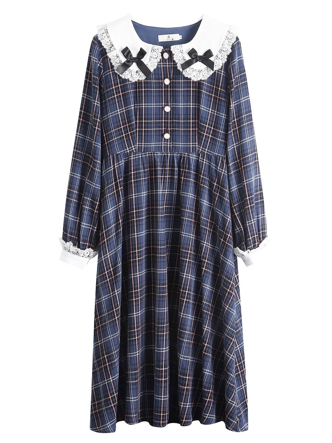 ワンピース 長袖 膝丈 フレア チェック柄 襟付き トラッド 大人カジュアル デート お出かけ