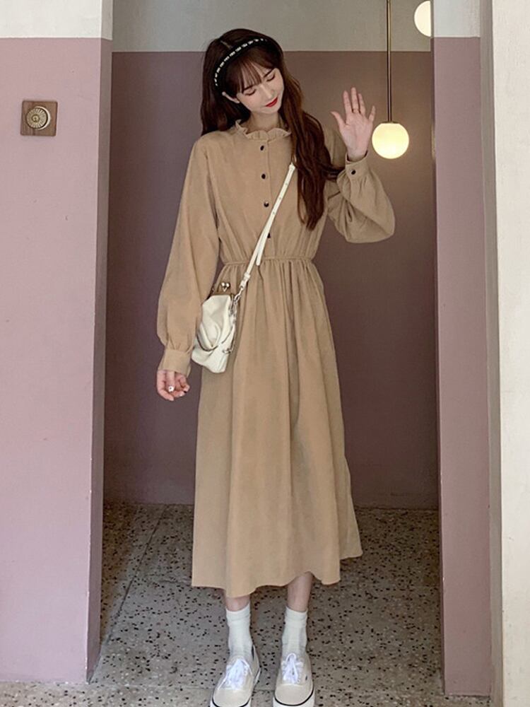 ワンピース 長袖 ミモレ丈 カーキ ブラック レッド ブルー 秋 レトロ