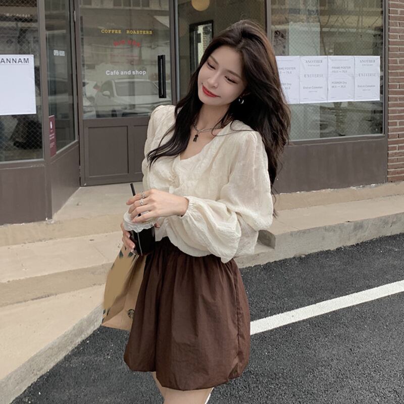 シャツ ブラウス 長袖 ショート丈 ボリュームスリーブ シンプル 無地 大人可愛い デート お出かけ