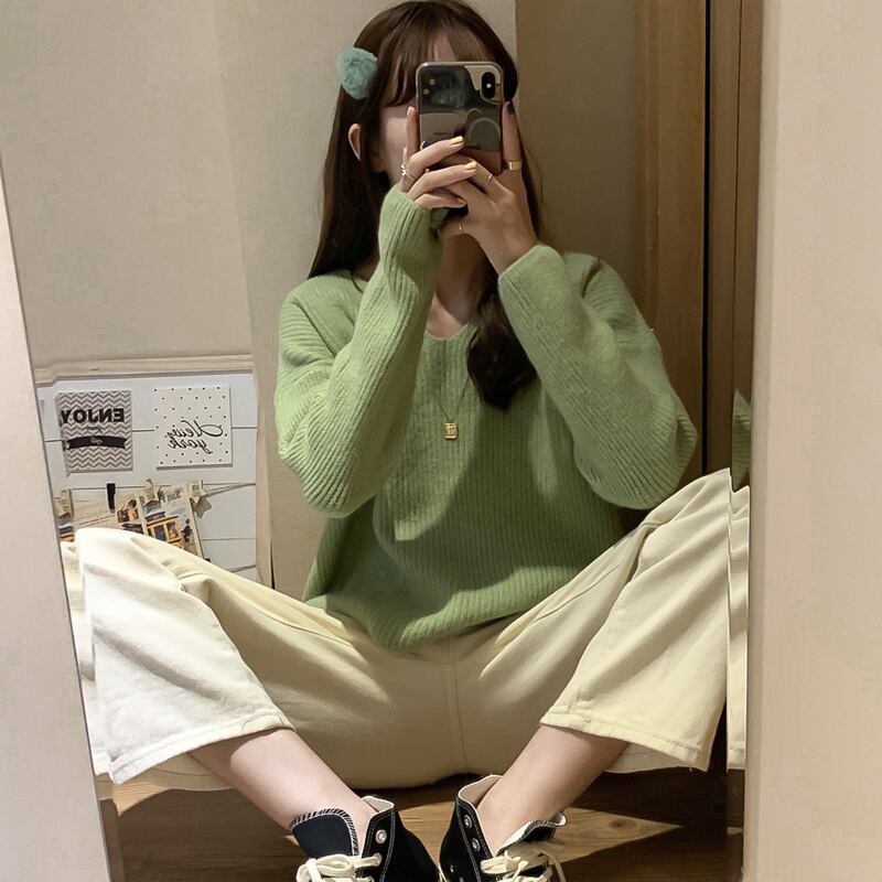トップス ニット セーター カラー ブルー ピンク グリーン ゆったり 長袖 Vネック