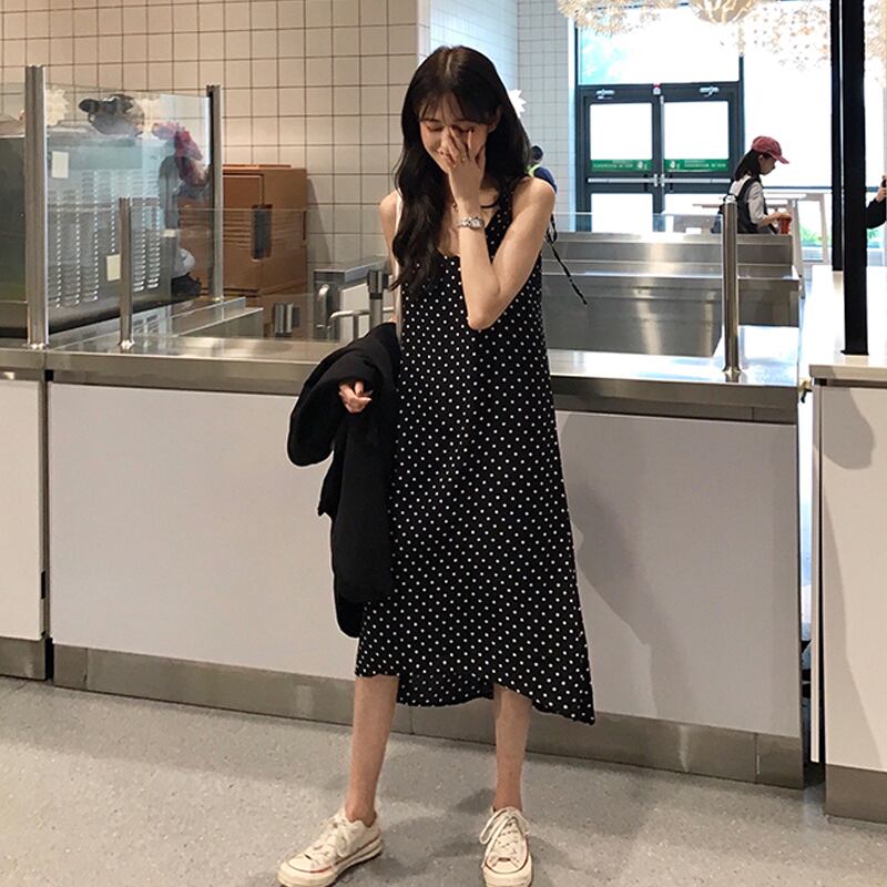 ワンピース ノースリーブ ミモレ丈 フレア ドット柄 大人可愛い デート お出かけ ゆったり