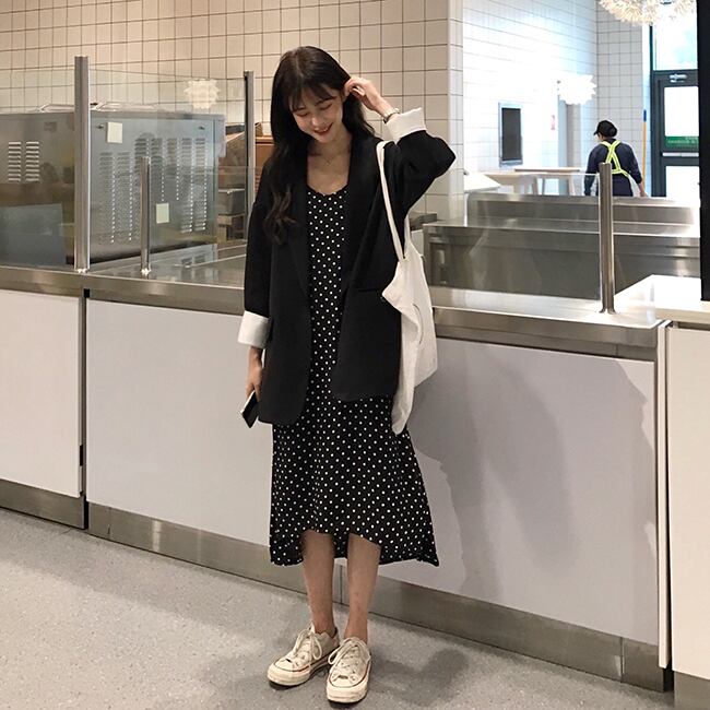 大人可愛いドット柄デザインのミモレ丈ワンピースです。