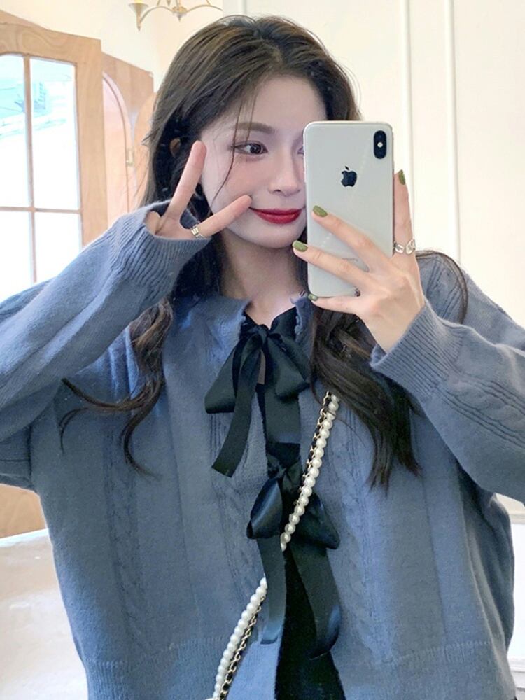 きれいめな無地カラーのキャミソールワンピースとリボンデザインのニット。