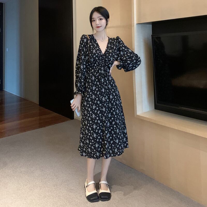 ワンピース ミモレ丈 長袖 小花柄 ブラック ホワイト Vネック 薄手 春 秋