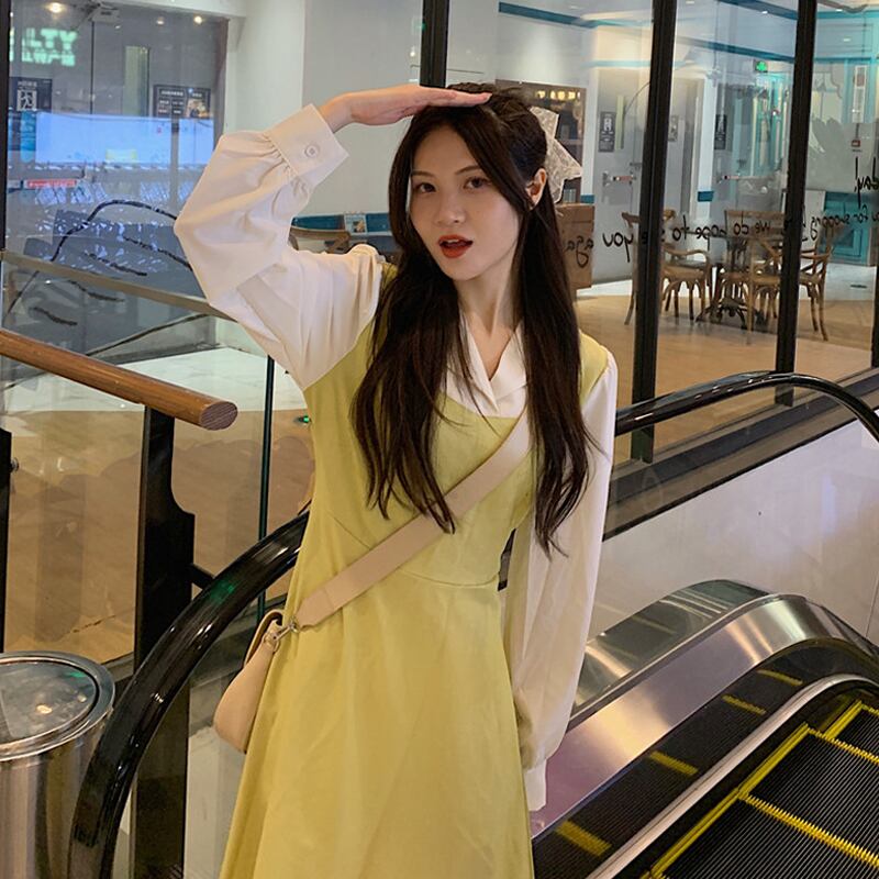 ワンピース 長袖 ミモレ丈 フレア バイカラー 重ね着風 大人カジュアル きれいめ デート お出かけ