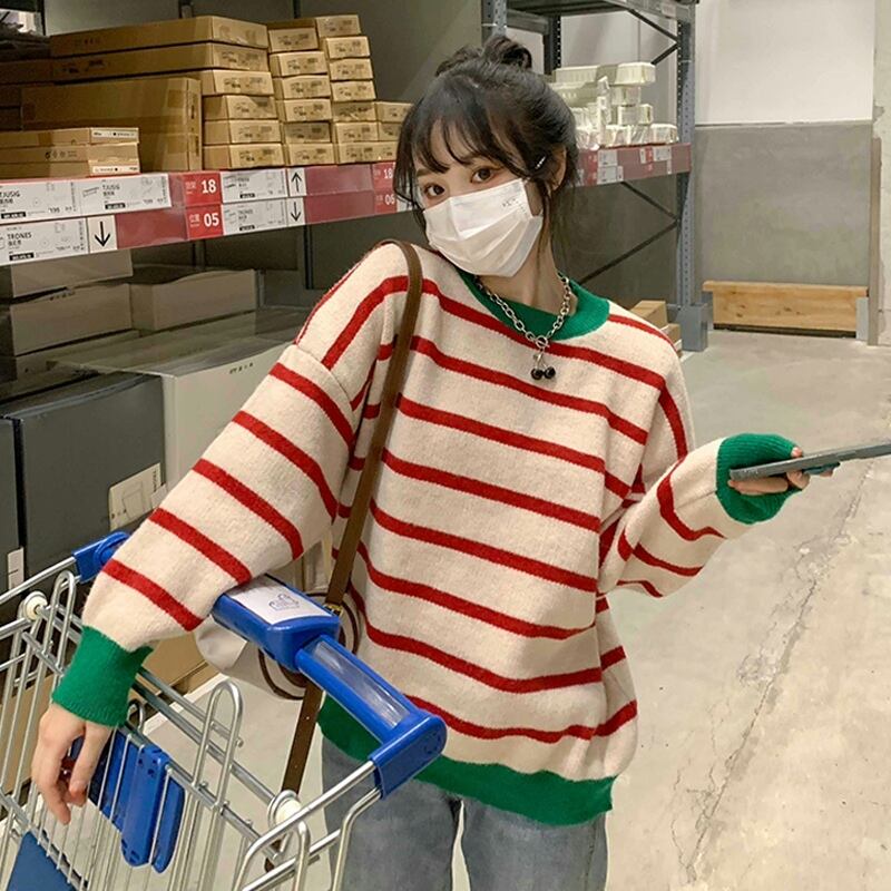 ニット 長袖 ラウンドネック ボーダー柄 ゆったり オーバーサイズ 大人カジュアル 秋