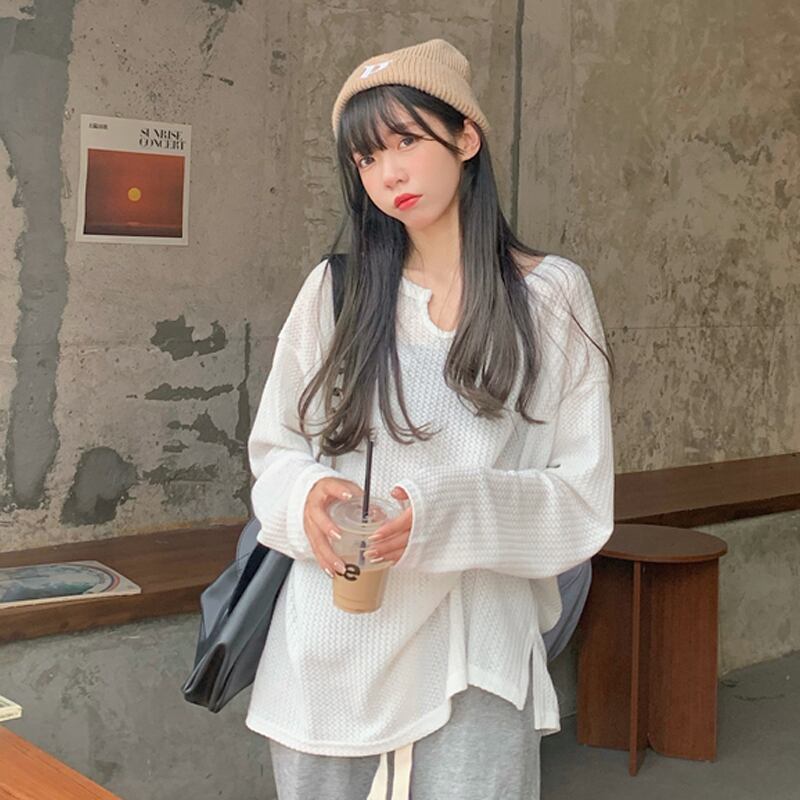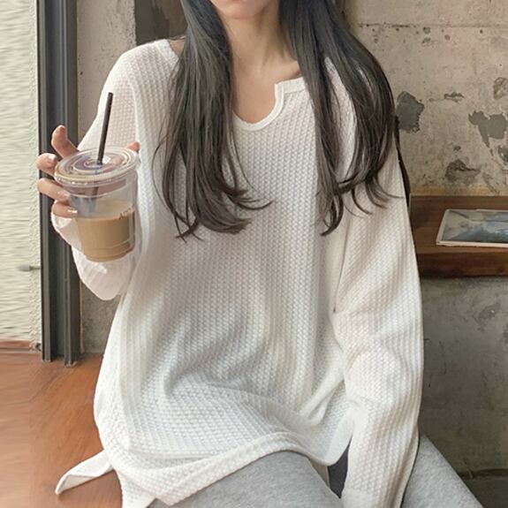 カットソー 長袖 シンプル 無地 キーネック ワッフル 大人カジュアル ゆったり オーバーサイズ