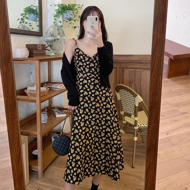 大人可愛い小花柄デザインのキャミソールワンピースと長袖カーディガンです♡