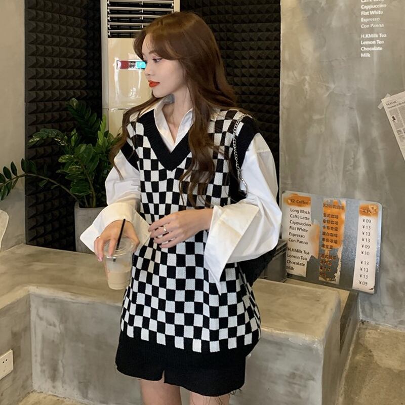 シャツ 長袖 シンプル 無地 大人カジュアル ベスト ニットベスト ダイヤ柄 モノトーン お出かけ