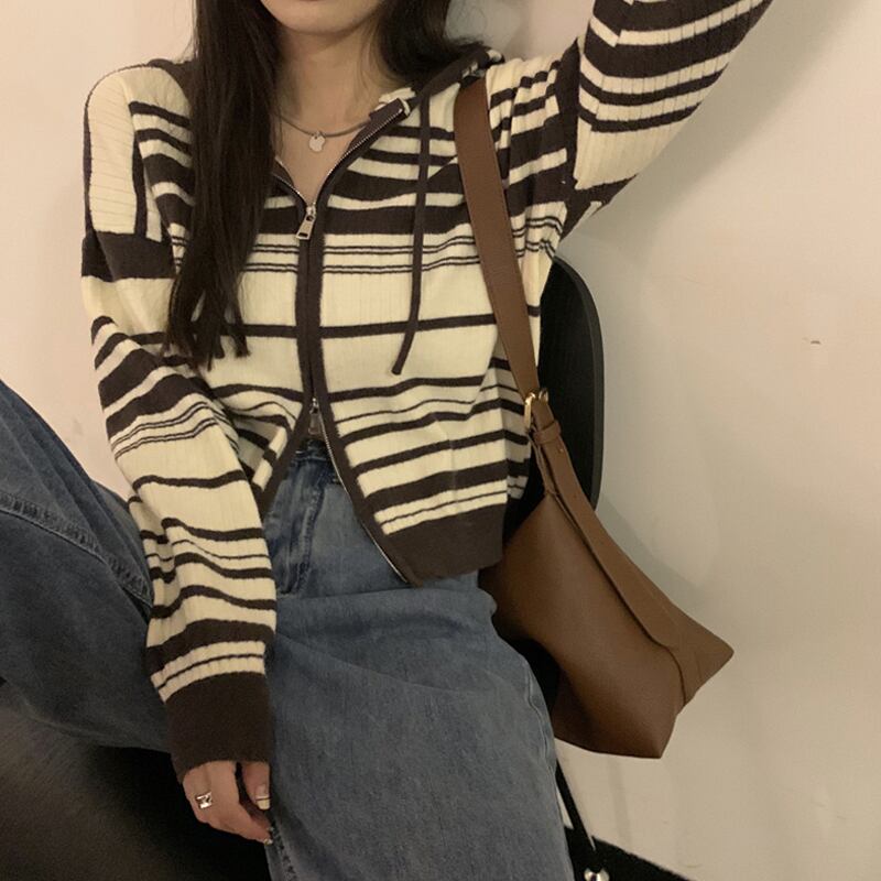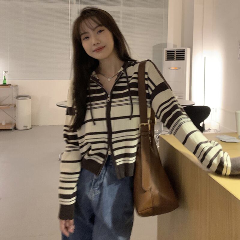 パーカー ニットパーカー フーディー 長袖 ショート丈 ジッパー ストライプ 大人カジュアル