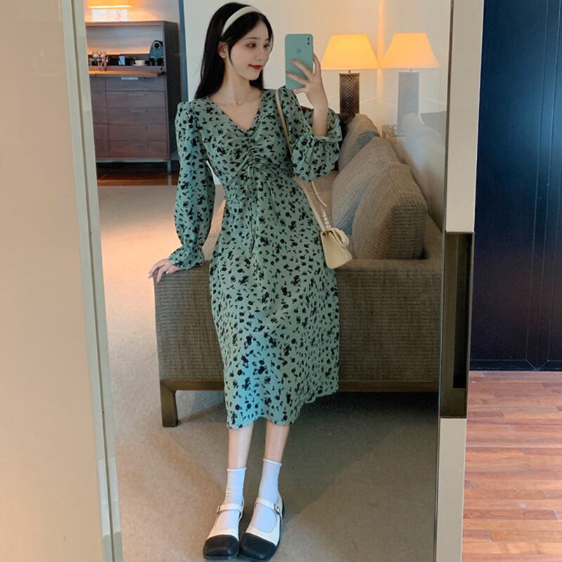 ワンピース 花柄 ミモレ丈 Vネック 細身 スリム 長袖 ブラック グリーン オフホワイト