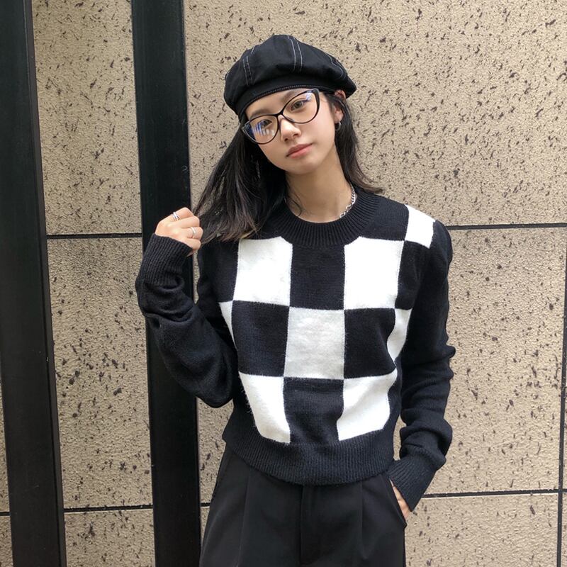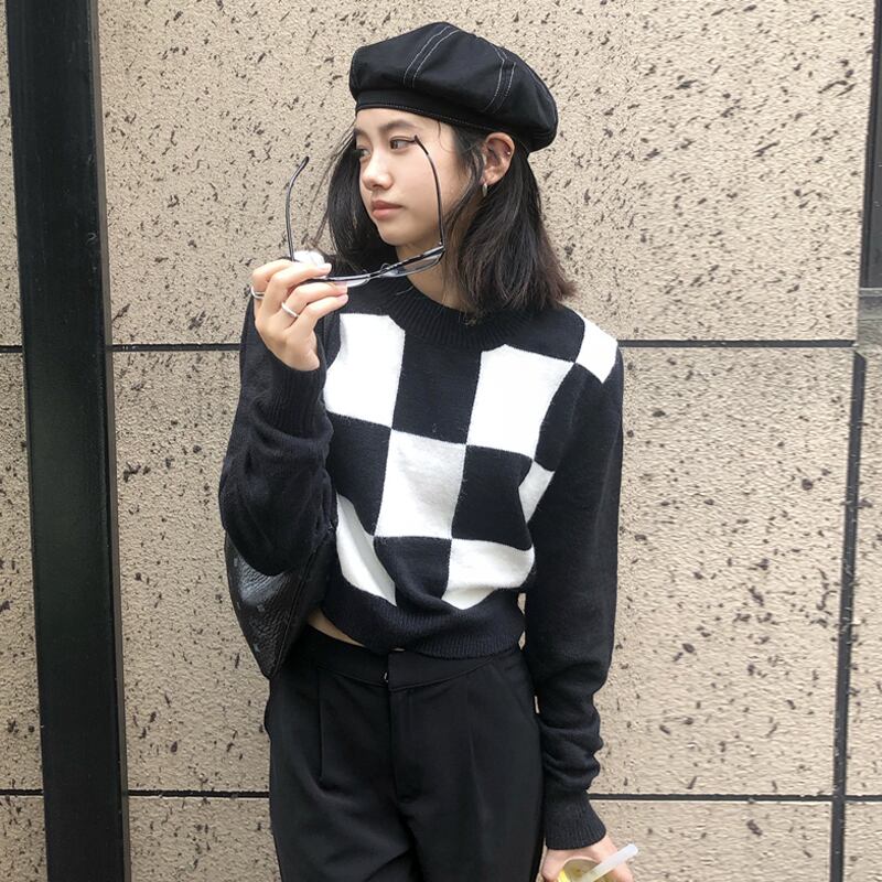 トップス ニット セーター 格子柄 チェック モノクロ 秋 冬